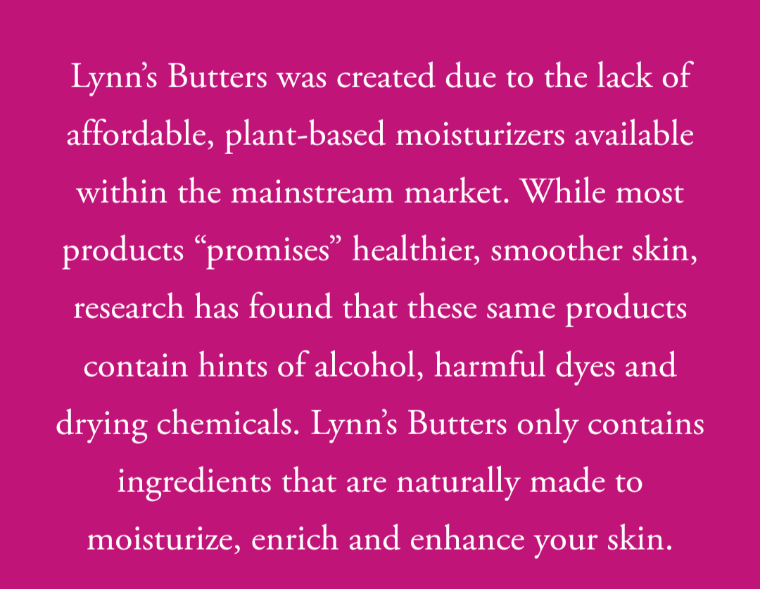 With you, my customers, I can visualize huge growth and opportunities. I will continue to evolve, grow and expose my products to individuals that would love to see their skin be the healthiest, softest and well-hydrated it can be.