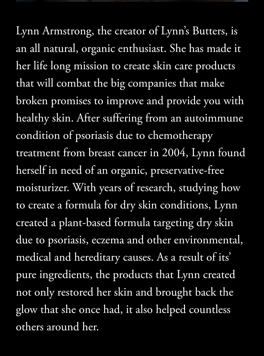 My mission is to produce quality, all natural, refined skin care products, for everyone, without the high cost. Eczema, psoriasis and dry skin are very familiar and familial to most of us. My products can be used by all nationalities and ethnicities.